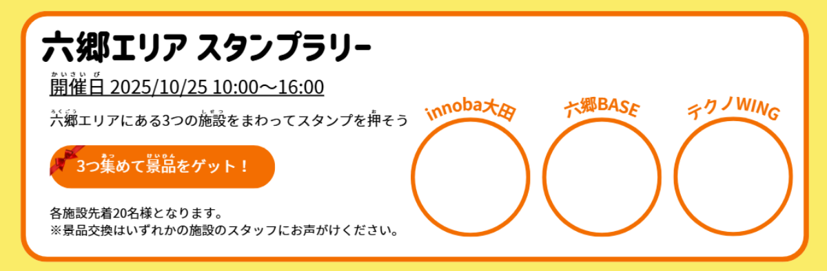 当日限定で六郷エリアの六郷BASE、innoba大田、テクノWINGをまわるスタンプラリーを開催します。