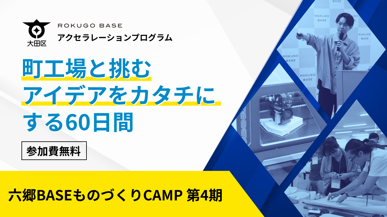 六郷BASE ものづくりCAMP(ものキャン)は、革新的な「ものづくりアイデア」の実現を目指す起業家のための約2か月間のアクセラレーションプログラムです。